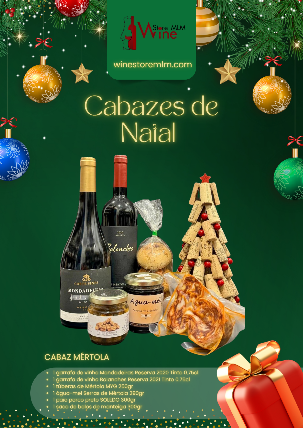Cabaz Mértola: vinhos premium, bolos de manteiga, enchidos e mel das Serras. Um presente tradicional único.